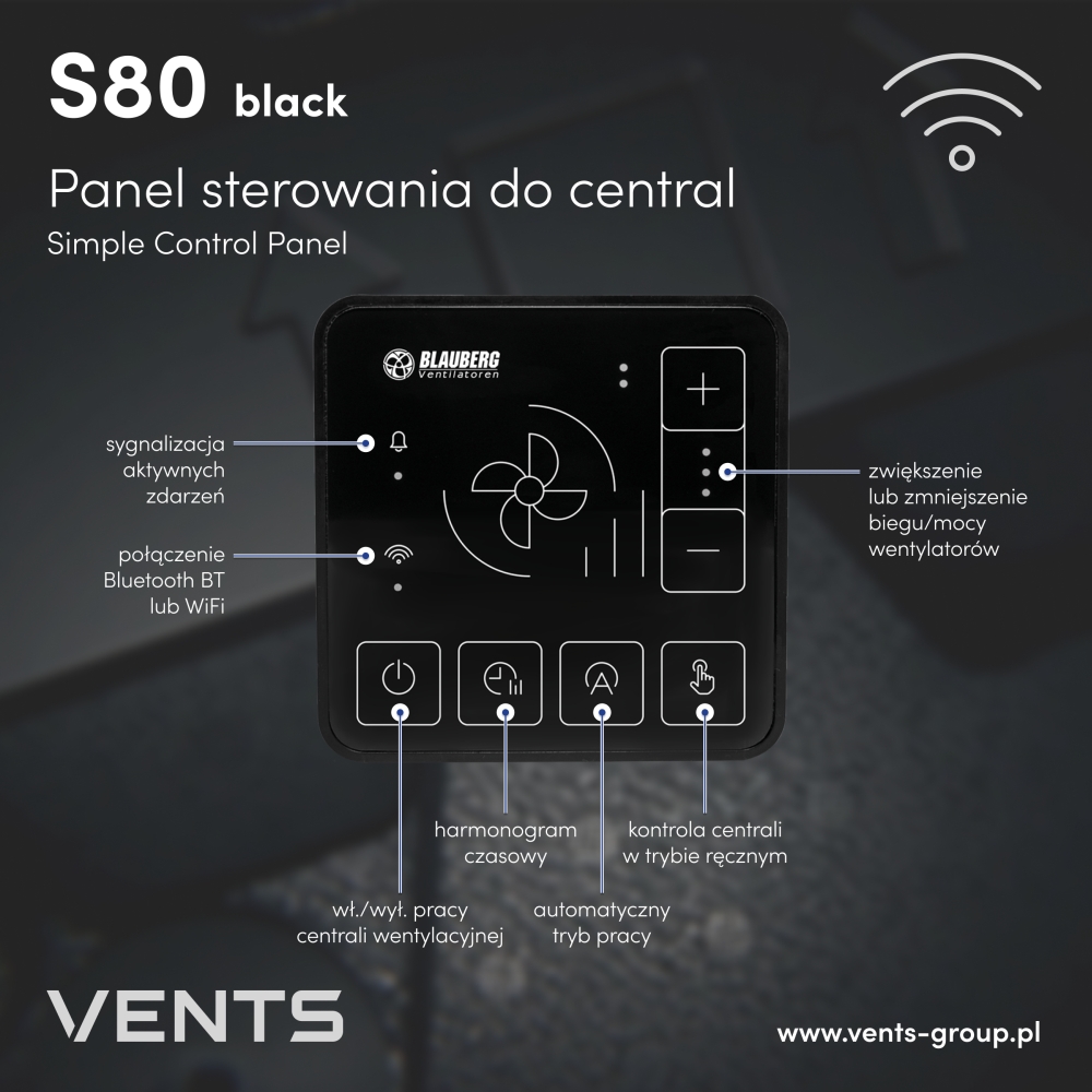 Wyłączenie (dioda LED przycisku wyłączona) lub włączenie (dioda LED przycisku włączona przez 5 sek.) pracy centrali wentylacyjnej. Praca włączonej centrali jest sygnalizowana również przez diody LED np. wybranego biegu wentylatora, włączonego trybu automatycznego, trybu harmonogramów, trybu ręcznego. Przycisk służy również do zmiany trybu pracy panelu pomiędzy Bluetooth BT a WiFi. Zmiana odbywa się poprzez przytrzymanie przycisku ok. 5 sek.