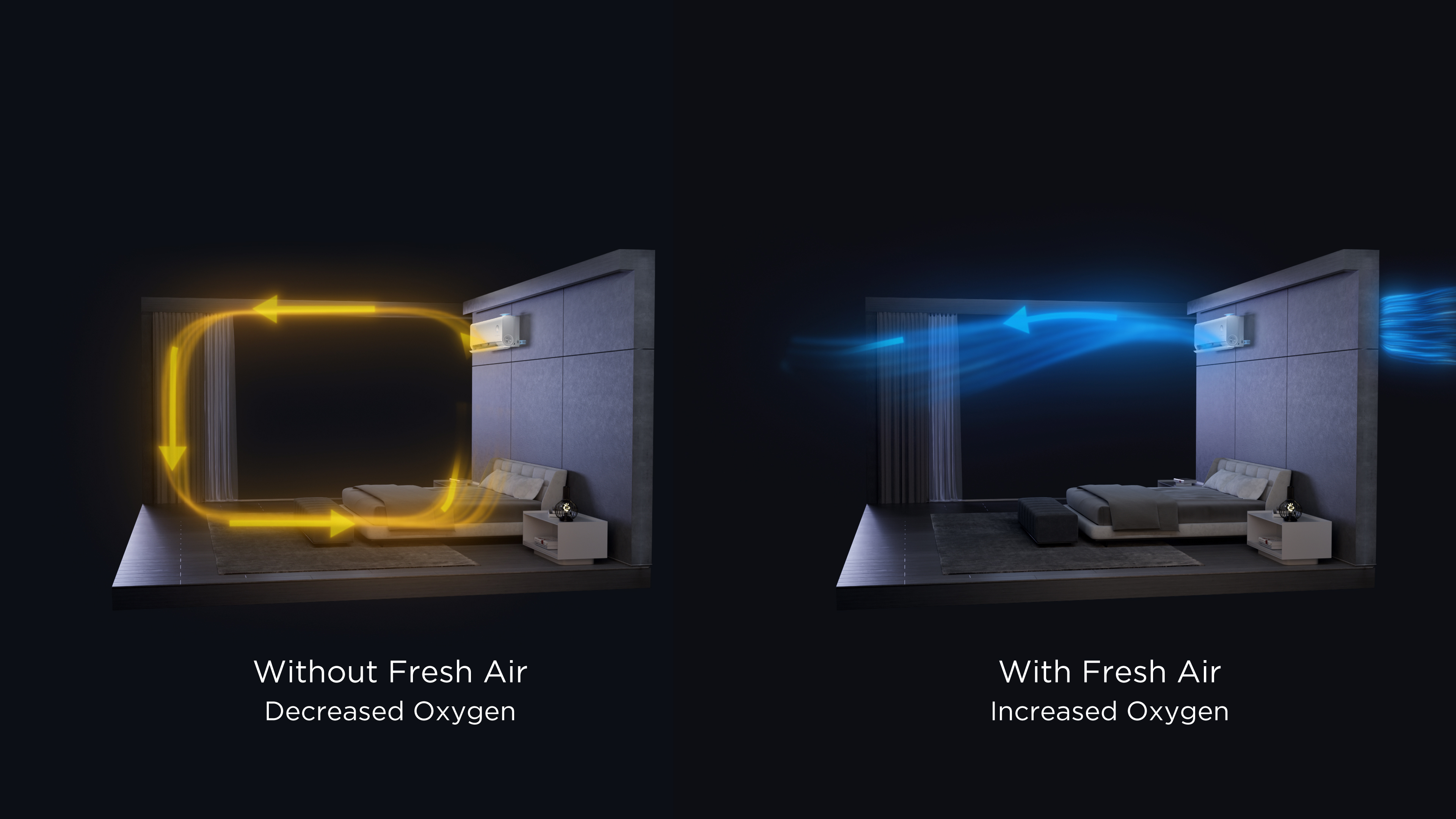 Przed wejściem do pomieszczenia świeże powietrze przechodzi przez wymiennik jednostki wewnętrznej. Jest chłodzony lub podgrzewany do zadanej temperatury z dokładnością ±0,5°C. Pozwala to uniknąć nieprzyjemnych wahań temperatury.